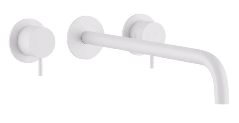 Минималистичен, стилен и издръжлив: този комплект от серията Waterevolution Flow съчетава изчистена матова бяла повърхност с елегантен излив 21 cm. Техниката остава скрита в стената, като се виждат само изтънчените копчета и изливът.